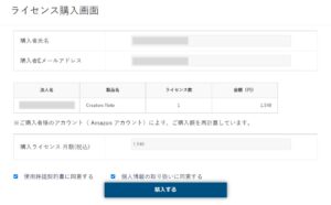 内容を確認の上、「使用許諾契約書に同意する」・「個人情報の取り扱いに同意する」にチェックを付け、「購入する」ボタンを押します。